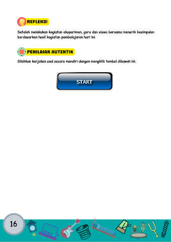 REFLEKSI Setelah melakukan kegiatan eksperimen, guru dan siswa bersama menarik kesimpulan berdasarkan hasil kegiatan pembelajaran hari ini. PENILAIAN AUTENTIK Silahkan kerjakan soal secara mandiri dengan mengklik tombol dibawah ini. 16