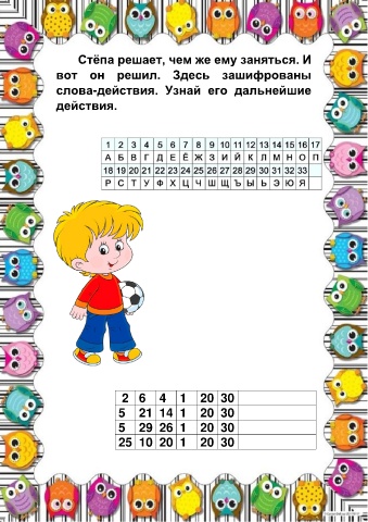 Стёпа решает, чем же ему заняться. И вот он решил. Здесь зашифрованы слова-действия. Узнай его дальнейшие действия. 2 6 4 1 20 30 5 21 14 1 20 30 5 29 26 1 20 30 25 10 20 1 20 30