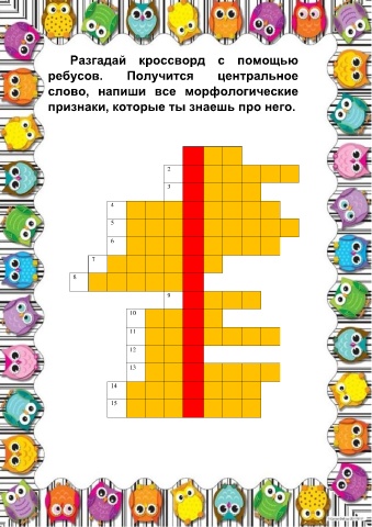 Разгадай кроссворд с помощью ребусов. Получится центральное слово, напиши все морфологические признаки, которые ты знаешь про него. 2 3 4 5 6 7 8 9 10 11 12 13 14 15