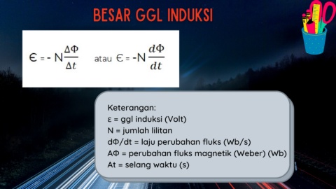 Keterangan: ε = ggl induksi (Volt) N = jumlah lilitan dΦ/dt = laju perubahan fluks (Wb/s) AΦ = perubahan fluks magnetik (Weber) (Wb) At = selang waktu (s)