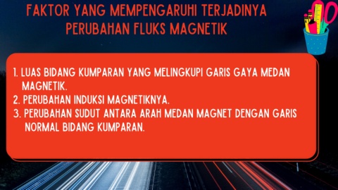 Faktor yang Mempengaruhi Terjadinya Perubahan Fluks Magnetik 1. Luas bidang kumparan yang melingkupi garis gaya medan magnetik. 2. Perubahan induksi magnetiknya. 3. Perubahan sudut antara arah medan magnet dengan garis normal bidang kumparan.