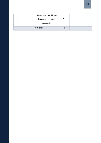 64 Ketepatan pemilihan kemasan produk 5 assesoris Total Skor 75