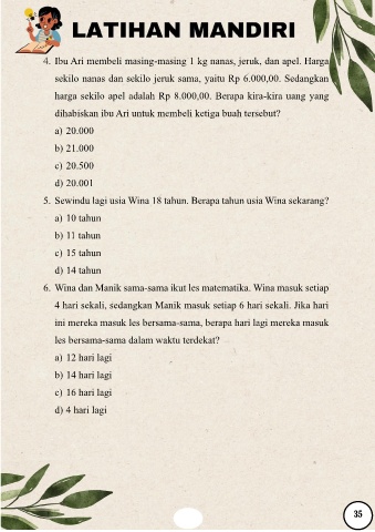 4. Ibu Ari membeli masing-masing 1 kg nanas, jeruk, dan apel. Harga
