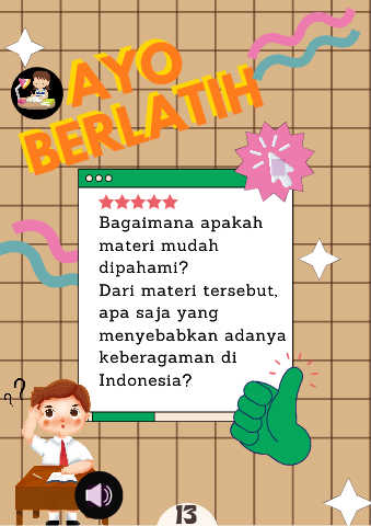 AYO AYO BERLATIH BERLATIH Bagaimana apakah materi mudah dipahami? Dari materi tersebut, apa saja yang menyebabkan adanya keberagaman di Indonesia? 13