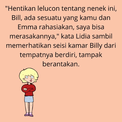 "Hentikan lelucon tentang nenek ini, Bill, ada sesuatu yang kamu dan Emma rahasiakan, saya bisa merasakannya," kata Lidia sambil memerhatikan seisi kamar Billy dari tempatnya berdiri, tampak berantakan.