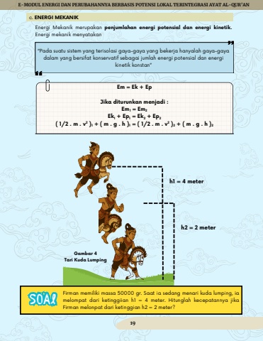 c. ENERGI MEKANIKE-MODUL ENERGI DAN PERUBAHANNYA BERBASIS POTENSI LOKAL TERINTEGRASI AYAT AL-QUR%u2019ANEnergi Mekanik merupakan penjumlahan energi potensial dan energi kinetik.Energi mekanik menyatakanEm = Ek + EpJika diturunkan menjadi :Em1 = Em2Ek1 + Ep1 = Ek2 + Ep2( 1/2 . m . v ) + ( m . g . h ) = ( 1/2 . m . v ) + ( m . g . h )21 122 2Firman memiliki massa 50000 gr. Saat ia sedang menari kuda lumping, iamelompat dari ketinggiian h1 = 4 meter. Hitunglah kecepatannya jikaFirman melonpat dari ketinggian h2 = 2 meter?SOAL%u201cPada suatu sistem yang terisolasi gaya-gaya yang bekerja hanyalah gaya-gayadalam yang bersifat konservatif sebagai jumlah energi potensial dan energikinetik konstan%u201dGambar 4Tari Kuda Lumpingh1 = 4 meterh2 = 2 meter19