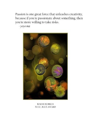 Passion is one great force that unleashes creativity, because if you're passionate about something, then you're more willing to take risks. - yoyo ma BOKEH BUBBLES FCCC, BLUE AWARD