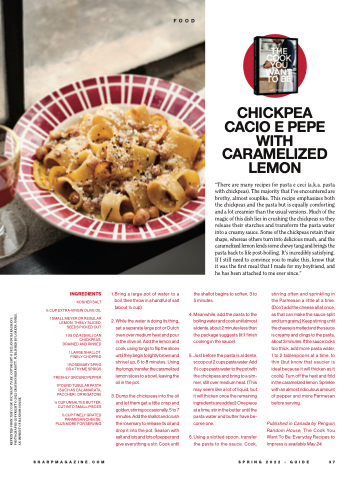 minutes Add the shallot and crush the rosemary to release its oil and drop it it into the pot Season with salt and and and lots lots and and and lots lots of pepper and and and give everything a stir Cook until the shallot begins to to soften 3 to to 5 minutes 4 Meanwhile add the the pasta to the the boiling water and cook until almost al dente about 2 minutes less than the package suggests (it’ll finish cooking in in the sauce) 5 Just before the pasta is al dente scoop out 2 cups pasta water Add 11⁄2 cups pasta water to the pot with the chickpeas and bring to a a a sim- mer still over medium heat (This may seem like a a lot of liquid but it will thicken once the remaining ingredients are added ) One piece at a a time stir in the the butter until the the pasta water and butter have be- come one 6 Using a a slotted spoon transfer the the pasta to the the sauce Cook stirring often and sprinkling in in in in the Parmesan a a a a a little at a a a a a time (Don’t add the cheese all at once as that can make the sauce split and turn grainy ) Keep stirring until the the cheese is melted and the the sauce is creamy and clings to the pasta about 3 minutes If the sauce looks too thick add more pasta water 1 to to 2 tablespoons at a a a time to to thin (but know that saucier is ideal because it it will thicken as it it cools) Turn off the heat and fold in in the caramelized lemon Sprinkle with an almost ridiculous amount of pepper and more Parmesan before serving Published in in Canada by Penguin Random House The Cook You Want To Be: Everyday Recipes to Impress is available May 24 REPRINTED FROM THE COOK