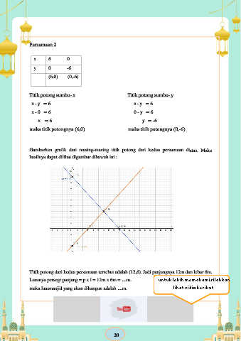 Titik potong dari kedua persamaan tersebut adalah (12,6). Jadi panjangnya 12m dan lebar 6m.