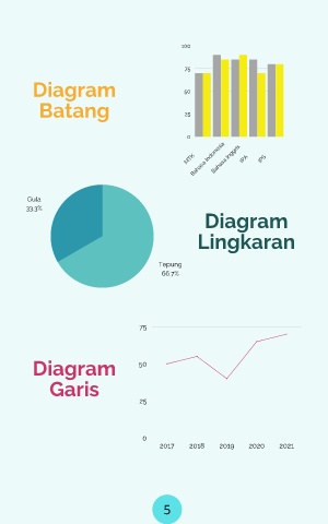 100 75 Diagram 50 Batang 25 0 Bahasa Inggris MTK Bahasa Indonesia IPA IPS Gula 33.3% Diagram Lingkaran Tepung 66.7% 75 Diagram 50 Garis 25 0 2017 2018 2019 2020 2021 5
