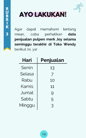 R U B AYO LAKUKAN! R I K Agar dapat memahami tentang 3 mean, coba perhatikan data penjualan pulpen merk Joy selama seminggu terakhir di Toko Wendy berikut ini, ya! Hari Penjualan Senin 13 Selasa 7 Rabu 10 Kamis 11 Jumat 9 Sabtu 5 Minggu 3 14