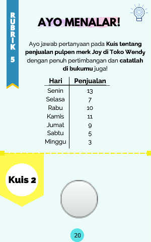 R U AYO MENALAR! B R I K Ayo jawab pertanyaan pada Kuis tentang penjualan pulpen merk Joy di Toko Wendy 5 dengan penuh pertimbangan dan catatlah di bukumu juga! Hari Penjualan Senin 13 Selasa 7 Rabu 10 Kamis 11 Jumat 9 Sabtu 5 Minggu 3 Kuis 2 20