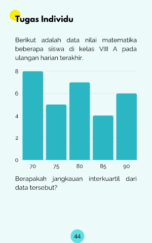 Tugas Individu Berikut adalah data nilai matematika beberapa siswa di kelas VIII A pada ulangan harian terakhir. 8 6 4 2 0 70 75 80 85 90 Berapakah jangkauan interkuartil dari data tersebut? 44