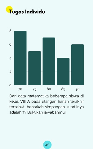 Tugas Individu 8 6 4 2 0 70 75 80 85 90 Dari data matematika beberapa siswa di kelas VIII A pada ulangan harian terakhir tersebut, benarkah simpangan kuartilnya adalah 7? Buktikan jawabanmu! 49