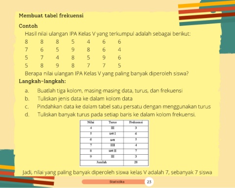 Jadi, nilai yang paling banyak diperoleh siswa kelas V adalah 7, sebanyak 7 siswa