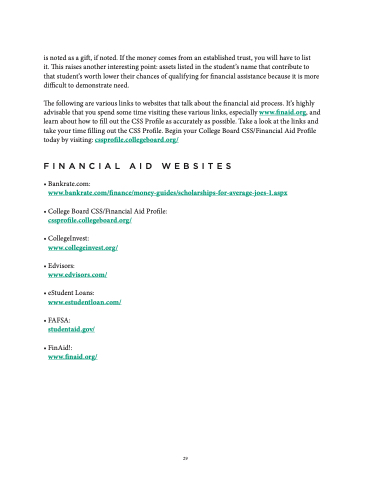 it it This raises another interesting point: assets listed in in in in in fin the the the the student’s student’s name that that contribute to to that that student’s student’s worth lower their chances of qualifying for financial assistance because it it is is is is is more difficult to demonstrate need The following are various various links links to websites that that talk about the the financial aid aid process It’s highly advisable that that you spend some time visiting these various various links links links especially www finaid org and and learn about how to fill fill out out out the the the the CSS CSS CSS Profile Profile Profile as as accurately as as possible Take a a a a a a a a a a a a a a a a a a a a a look at at at the the the the links links and and take your your time filling out out out the the the CSS CSS CSS Profile Profile Profile Begin your your College Board CSS/Financial Aid Profile Profile Profile today by visiting: cssprofile collegeboard org/