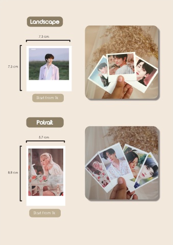 Landscape 7,3 cm 7,3 cm Start from 1k Potrait 5,7 cm 8,8 cm Start from 1k