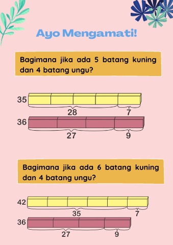 Ayo Mengamati! Bagimana jika ada 5 batang kuning dan 4 batang ungu? Bagimana jika ada 6 batang kuning dan 4 batang ungu?
