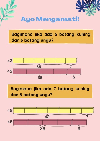 Ayo Mengamati! Bagimana jika ada 6 batang kuning dan 5 batang ungu? Bagimana jika ada 7 batang kuning dan 5 batang ungu?