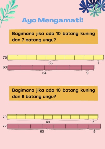 Ayo Mengamati! Bagimana jika ada 10 batang kuning dan 7 batang ungu? Bagimana jika ada 10 batang kuning dan 8 batang ungu?