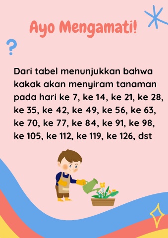 Ayo Mengamati! Dari tabel menunjukkan bahwa kakak akan menyiram tanaman pada hari ke 7, ke 14, ke 21, ke 28, ke 35, ke 42, ke 49, ke 56, ke 63, ke 70, ke 77, ke 84, ke 91, ke 98, ke 105, ke 112, ke 119, ke 126, dst