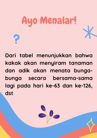 Ayo Menalar! Dari tabel menunjukkan bahwa kakak akan menyiram tanaman dan adik akan menata bunga- bunga secara bersama-sama lagi pada hari ke-63 dan ke-126, dst