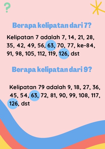 Berapa kelipatan dari 7? Kelipatan 7 adalah 7, 14, 21, 28, Berapa kelipatan dari 9? 35, 42, 49, 56, 63, 70, 77, ke-84, 91, 98, 105, 112, 119, 126, dst Kelipatan 79 adalah 9, 18, 27, 36, 45, 54, 63, 72, 81, 90, 99, 108, 117, 126, dst