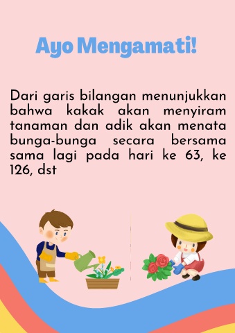 Ayo Mengamati! Dari garis bilangan menunjukkan bahwa kakak akan menyiram tanaman dan adik akan menata bunga-bunga secara bersama sama lagi pada hari ke 63, ke 126, dst