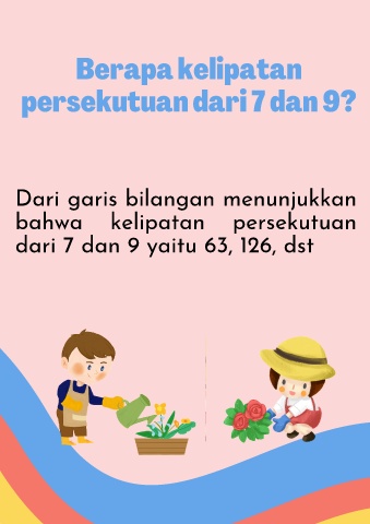 Berapa kelipatan persekutuan dari 7 dan 9? Dari garis bilangan menunjukkan bahwa kelipatan persekutuan dari 7 dan 9 yaitu 63, 126, dst
