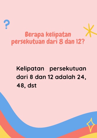 Berapa kelipatan persekutuan dari 8 dan 12? Kelipatan persekutuan dari 8 dan 12 adalah 24, 48, dst