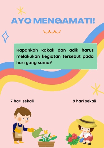 AYO MENGAMATI! Kapankah kakak dan adik harus melakukan kegiatan tersebut pada hari yang sama? 7 hari sekali 9 hari sekali