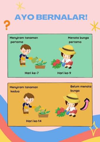 AYO BERNALAR! Menyiram tanaman Menata bunga pertama pertama Hari ke-7 Hari ke-9 Menyiram tanaman Belum menata kedua bunga Hari ke-14