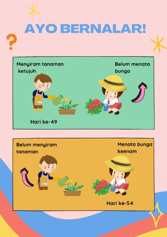 AYO BERNALAR! Menyiram tanaman Belum menata ketujuh bunga Hari ke-49 Belum menyiram Menata bunga tanaman keenam Hari ke-54