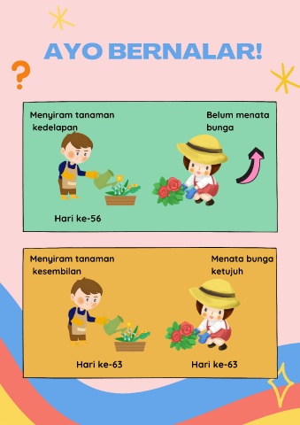 AYO BERNALAR! Menyiram tanaman Belum menata kedelapan bunga Hari ke-56 Menyiram tanaman Menata bunga kesembilan ketujuh Hari ke-63 Hari ke-63