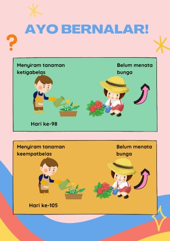 AYO BERNALAR! Menyiram tanaman Belum menata ketigabelas bunga Hari ke-98 Menyiram tanaman Belum menata keempatbelas bunga Hari ke-105