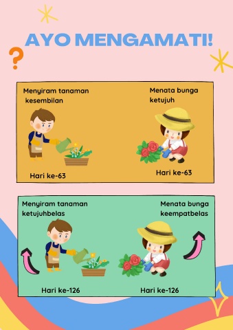AYO MENGAMATI! Menyiram tanaman Menata bunga kesembilan ketujuh Hari ke-63 Hari ke-63 Menyiram tanaman Menata bunga ketujuhbelas keempatbelas Hari ke-126 Hari ke-126