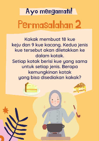 Permasalahan 2 Ayo mengamati! Kakak membuat 18 kue keju dan 9 kue kacang. Kedua jenis kue tersebut akan diletakkan ke dalam kotak. Setiap kotak berisi kue yang sama untuk setiap jenis. Berapa kemungkinan kotak yang bisa disediakan kakak?