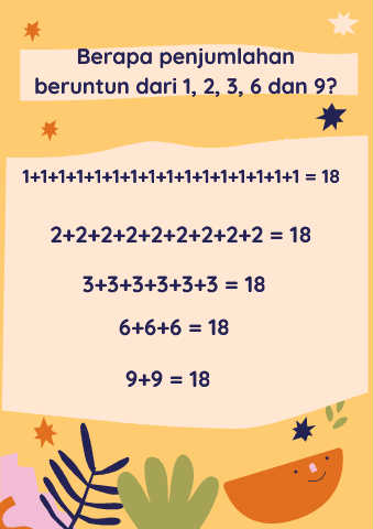 Berapa penjumlahan beruntun dari 1, 2, 3, 6 dan 9? 1+1+1+1+1+1+1+1+1+1+1+1+1+1+1+1 = 18 2+2+2+2+2+2+2+2+2 = 18 3+3+3+3+3+3 = 18 6+6+6 = 18 9+9 = 18