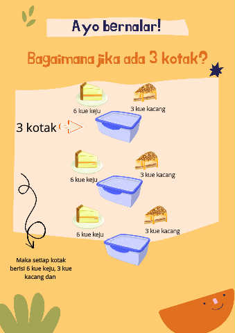 Ayo bernalar! Bagaimana jika ada 3 kotak? 6 kue keju 3 kue kacang 3 kotak 3 kue kacang 6 kue keju 3 kue kacang 6 kue keju Maka setiap kotak berisi 6 kue keju, 3 kue kacang dan