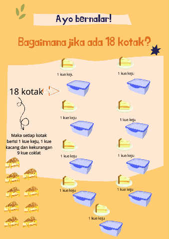 Bagaimana jika ada 18 kotak? Ayo bernalar! 1 kue keju 1 kue keju 18 kotak 1 kue keju 1 kue keju Maka setiap kotak berisi 1 kue keju, 1 kue kacang dan kekurangan 9 kue coklat 1 kue keju 1 kue keju 1 kue keju 1 kue keju 1 kue keju