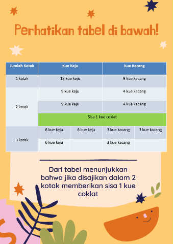 Perhatikan tabel di bawah! Dari tabel menunjukkan bahwa jika disajikan dalam 2 kotak memberikan sisa 1 kue coklat