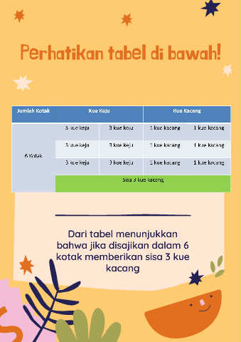 Perhatikan tabel di bawah! Dari tabel menunjukkan bahwa jika disajikan dalam 6 kotak memberikan sisa 3 kue kacang