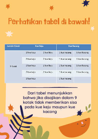 Perhatikan tabel di bawah! Dari tabel menunjukkan bahwa jika disajikan dalam 9 kotak tidak memberikan sisa pada kue keju maupun kue kacang