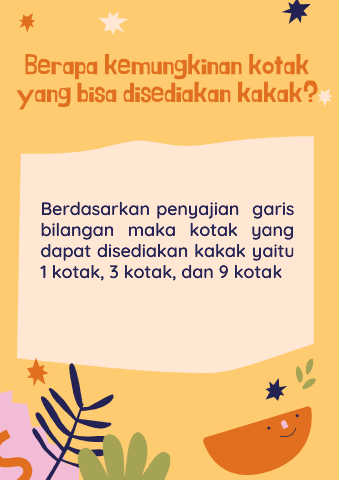 Berapa kemungkinan kotak yang bisa disediakan kakak? Berdasarkan penyajian garis bilangan maka kotak yang dapat disediakan kakak yaitu 1 kotak, 3 kotak, dan 9 kotak