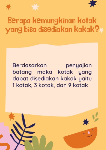 Berapa kemungkinan kotak yang bisa disediakan kakak? Berdasarkan penyajian batang maka kotak yang dapat disediakan kakak yaitu 1 kotak, 3 kotak, dan 9 kotak