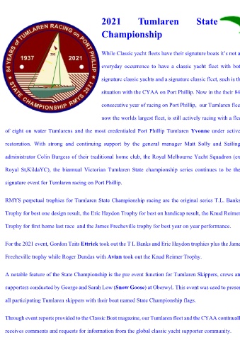 Royal St,KildaYC), the biannual Victorian Tumlaren State championship series continues to be the