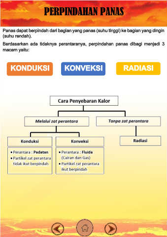 PERPINDAHAN PANAS Panas dapat berpindah dari bagian yang panas (suhu tinggi) ke bagian yang dingin (suhu rendah). Berdasarkan ada tidaknya perantaranya, perpindahan panas dibagi menjadi 3 macam yaitu: KONDUKSI KONVEKSI RADIASI