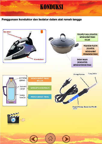 KONDUKSI Penggunaan konduktor dan isolator dalam alat rumah tangga PENUNTUP KACA (ISOLATOR) MENGHAMBAT PANAS KELUAR PEGANGAN PLASTIK (ISOLATOR) MENGHAMBAT PERAMBATAN PANAS BADAN WAJAN (KONDUKTOR) MENGHANTARKAN PANAS