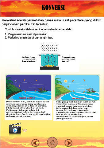 KONVEKSI Konveksi adalah perambatan panas melalui zat perantara, yang diikuti perpindahan partikel zat tersebut. Contoh konveksi dalam kehidupan sehari-hari adalah: 1. Pergerakan air saat dipanaskan 2. Peristiwa angin darat dan angin laut.
