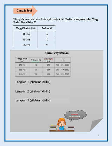 Contoh Soal Hitunglah mean dari data kelompok berikut ini! Berikut merupakan tabel Tinggi Badan Siswa Kelas X: Tinggi Badan (cm) Frekuensi 156-160 10 161-165 10 166-170 20 Cara Penyelesaian 2